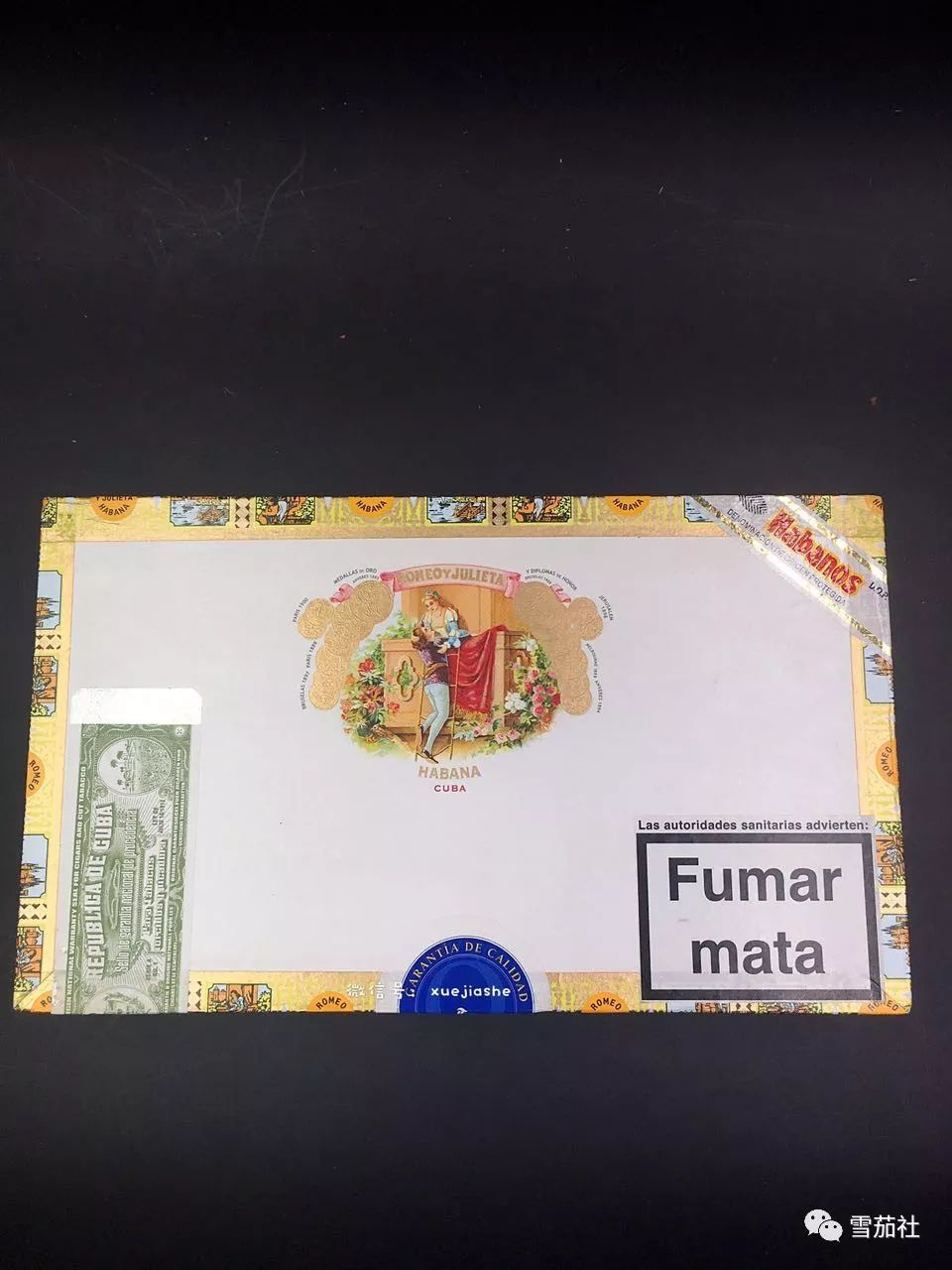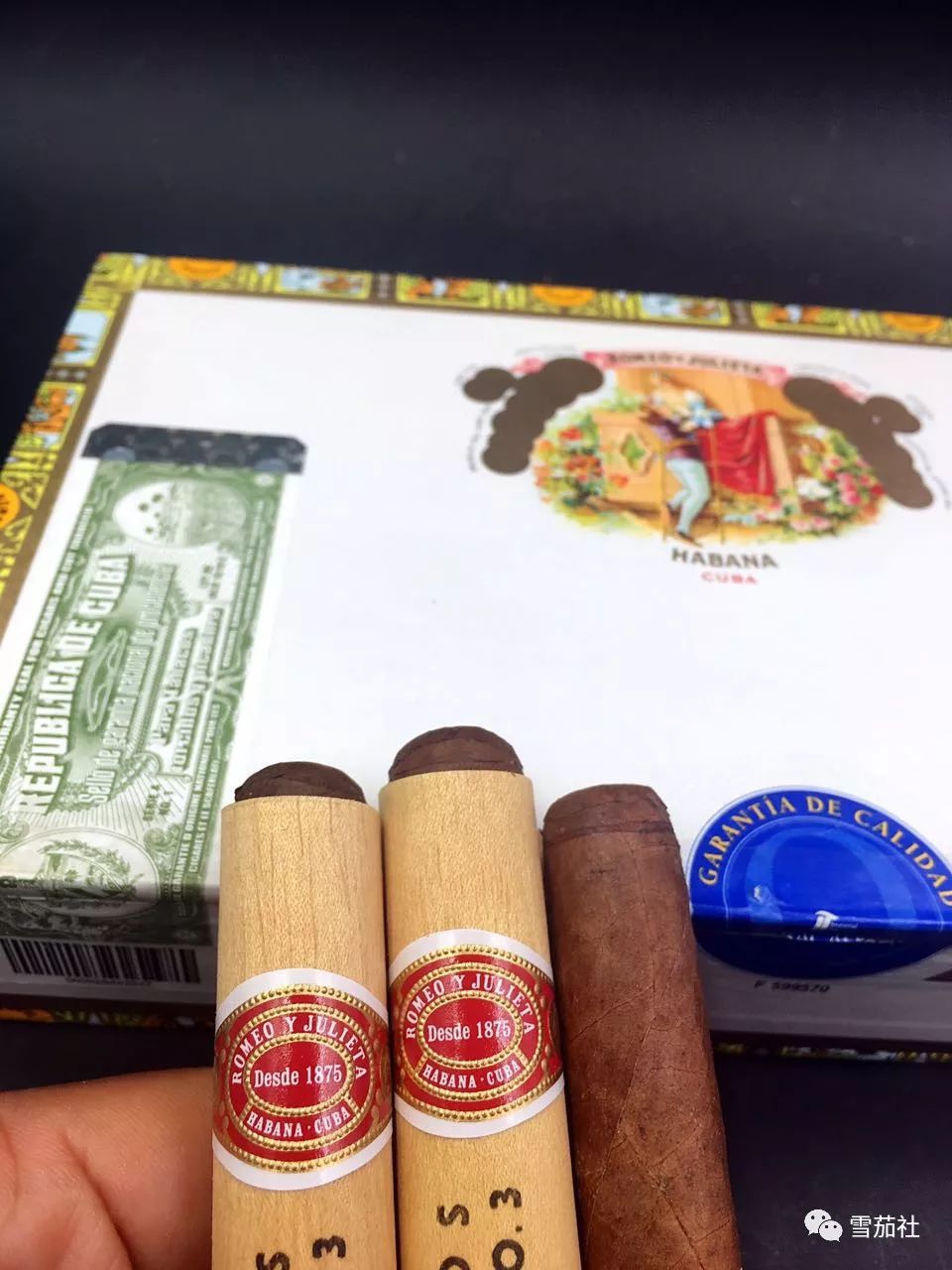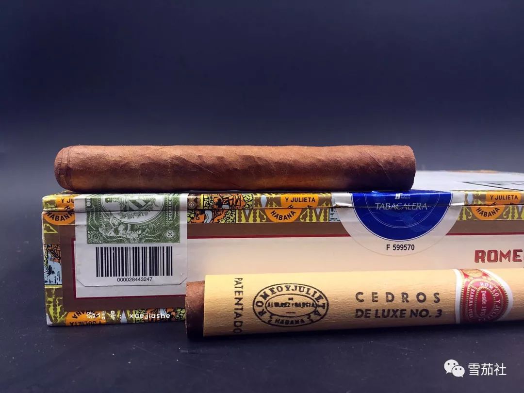 这款雪茄外边套着一层雪松木,罗密欧烟标安置在雪松木外,看起来相当别致。