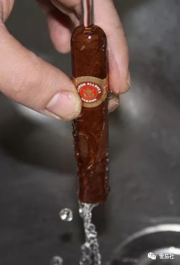 为了把雪茄浇湿,你需要义无反顾地将雪茄树立,放在川流不息的水龙头下,在那里保持6-7秒。千万别认为这几秒就可以泡湿雪茄,其实茄衣起到雨衣的作用,像功能性的户外外套一样,可以阻挡水进入茄衣内一层的茄套中。