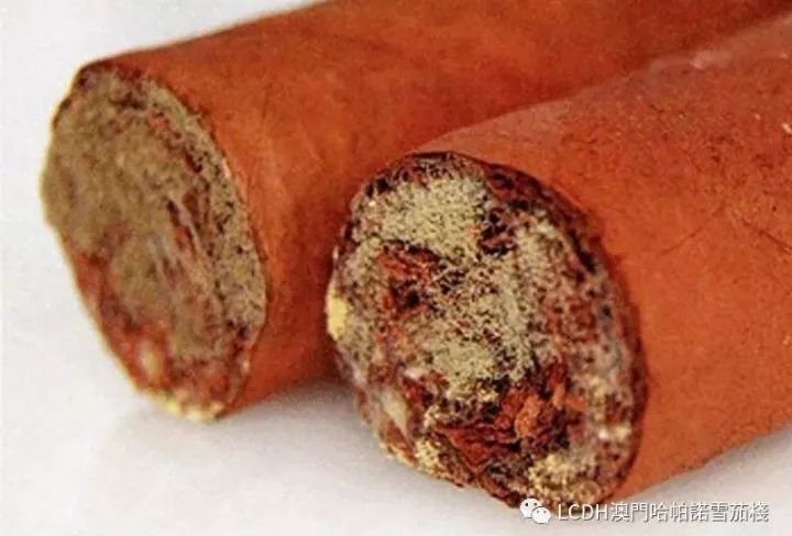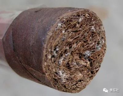 但是如果像下图那样,雪茄的尾部长霉的话,那雪茄就救不了,因为徽菌有可能已经蔓延到茄套和茄芯里面不能彻底刷扫的地方,那就只能忍痛把它们扔掉了。