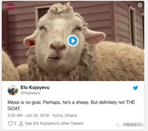 “梅西不是山羊(GOAT, Greatest of All Time “历史最佳”的简写),可能,他是一只绵羊,但绝对不是山羊!”