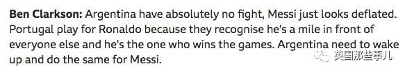 “阿根廷完全没有斗志,梅西看起来很泄气。葡萄牙队全队以C罗为中心作战,那是因为他们的球员都意识到自己跟C罗的差距不是一点点,C罗才是那个能赢下比赛的人。