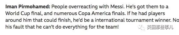 “人们是不是对梅西这次的失败太激动了。是他带领阿根廷队打入世界杯,打入美洲杯。