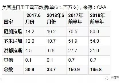 数据美国雪茄协会(CAA)显示,2018年上半年,美国从八大主要雪茄进口国进口的雪茄比去年同期增长9.9个百分点,接近1.66亿支雪茄。