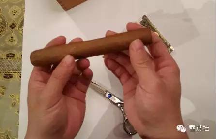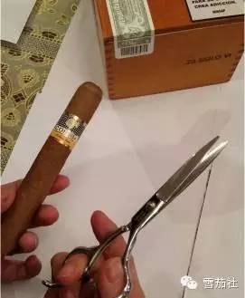 我们用剪刀剪开他的标签,打开他的茄帽,通常在抽吸中我们会用雪茄剪切开,为了完整得到雪茄的茄衣,我们只有从此入手。