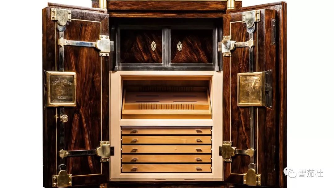 这个雪茄柜子师出名门,是由德国最著名的雪茄配件公司阿多里尼公司修复了十九世纪的保险箱,改装成柜式的保湿箱,这个古董货命名为“Cassaforte”(意大利语的意思是安全起见),并给它标上7万欧元约合80757美元。