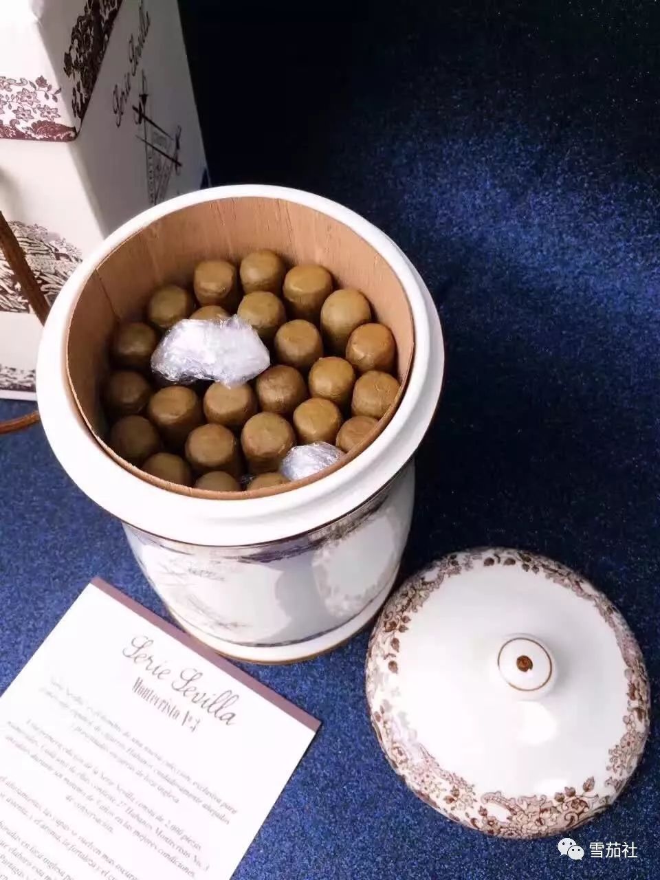 第一,号称陶瓷罐雪茄,当然它的外型都为清一色的青花瓷。白色的陶瓷,加上深蓝色的花纹和英文,看起来非常古朴典雅,富有年份气息,感觉从深土中挖出的存放几辈子的宝藏一般。
