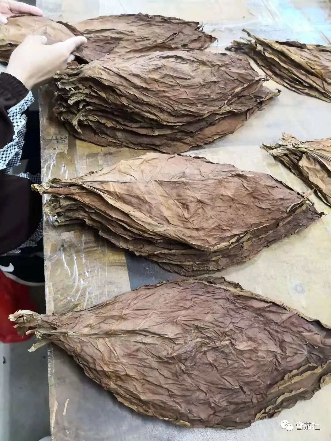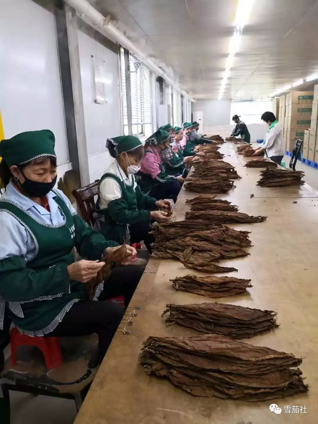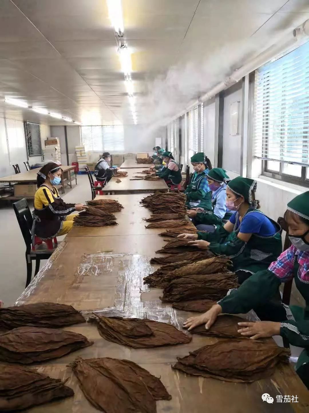 在持续加湿气的环境中,工人们把醇化好的烟叶按照尺寸、大小、醇化情况等条件分等级,进行烟叶分拣。