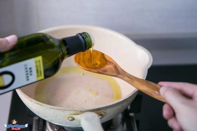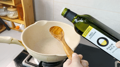 架锅开火,倒入西班牙特级初榨橄榄油,油量可以稍微大点儿,控制不好可以用勺子一点点倒啊。