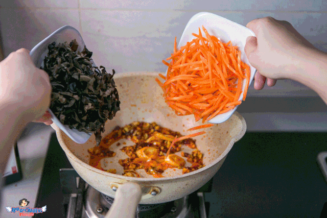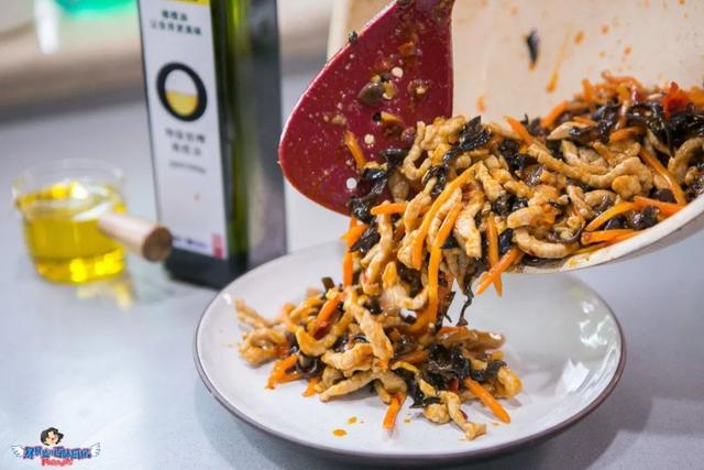 下入木耳丝和胡萝卜丝炒软,然后倒入肉丝,翻炒均匀。