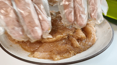 鸡胸横切大片,用小肉锤锤到松软。用五香粉和料酒把鸡肉抹匀,腌制2分钟。