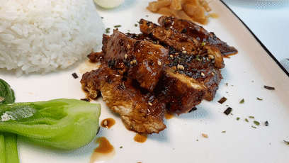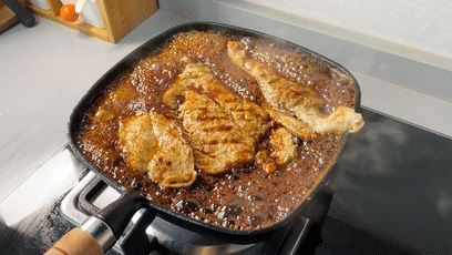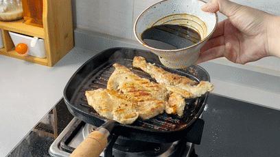 倒入照烧汁,小火焖煮2分钟后,大火收汁。