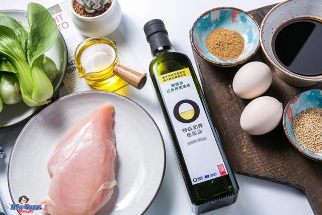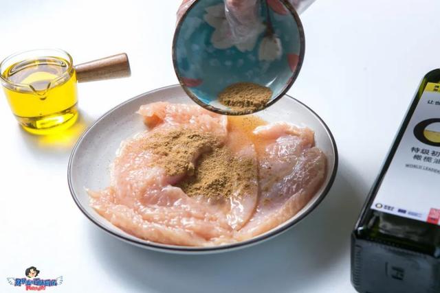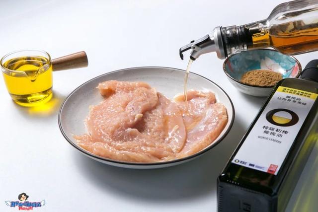 开中火,倒入西班牙特级初榨橄榄油,因为鸡胸油脂很少,橄榄油又很健康不容易胖,所以我用这个搭配,完美取代了常用的鸡腿肉哦。