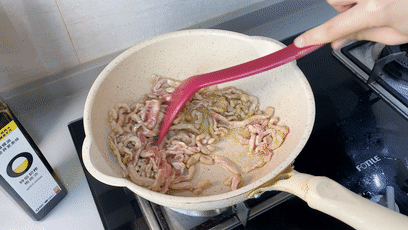 橄榄油烧热后,下入肉丝划散,炒到肉丝发白,盛出待用。