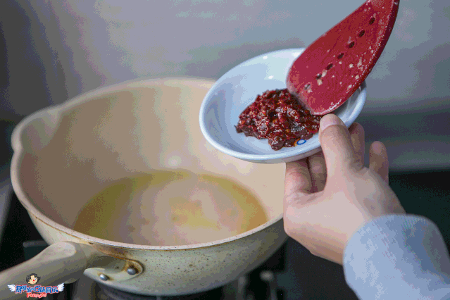 刚才剩的油就够了,不用另加啦,倒入豆瓣酱,炒出红油。