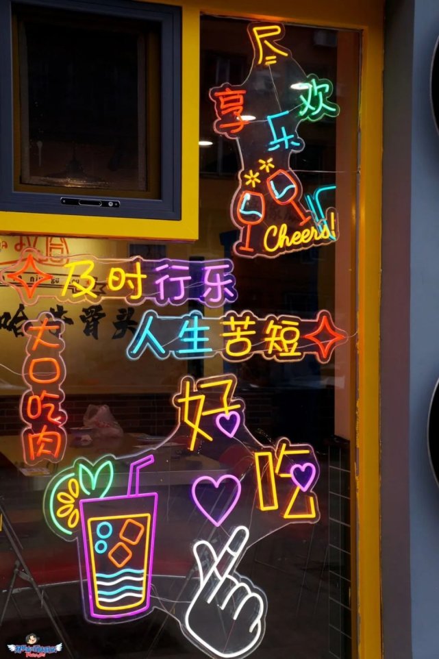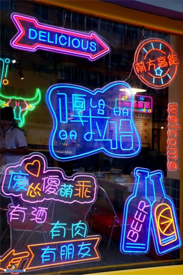 每当夜幕降临,店里店外的霓虹灯亮起,“我说牛头你说要”、“吃的舒服吃的实在”、“啃肉有理”……各种标语在身边环绕,就像一个rapper在耳边说唱,沉浸式享受,吃肉喝酒太快乐了!