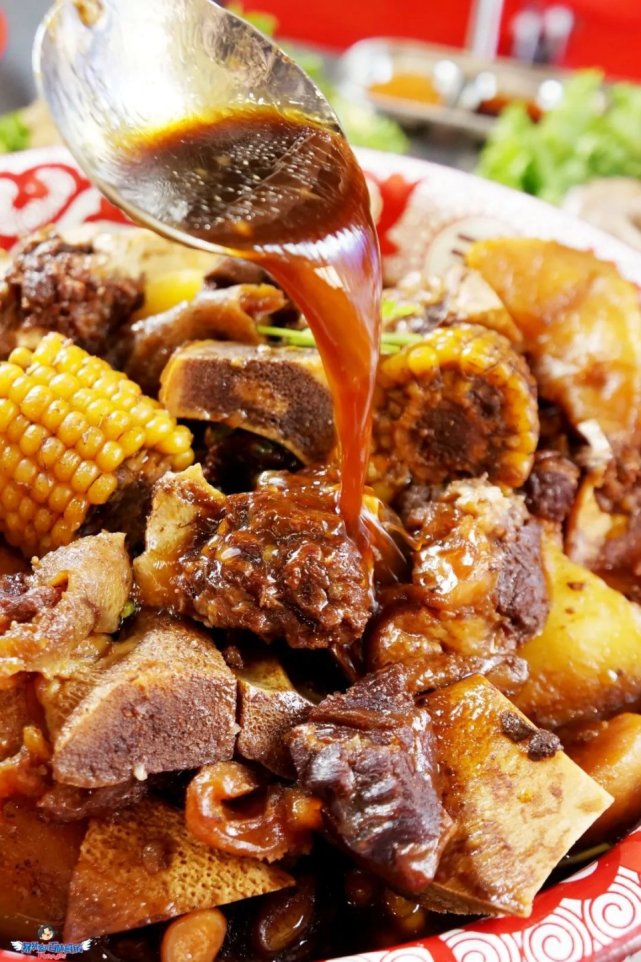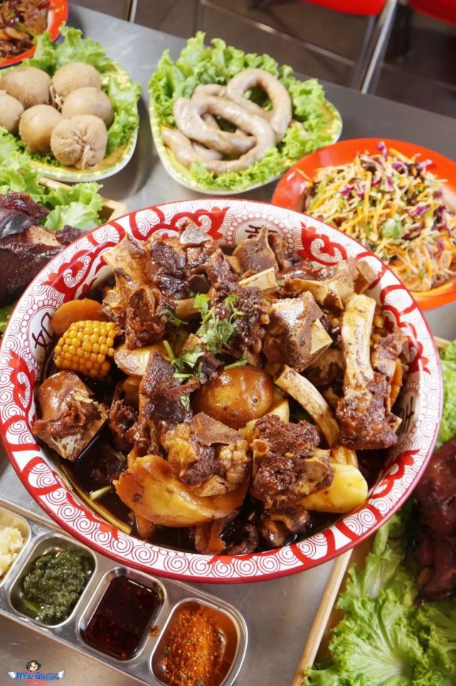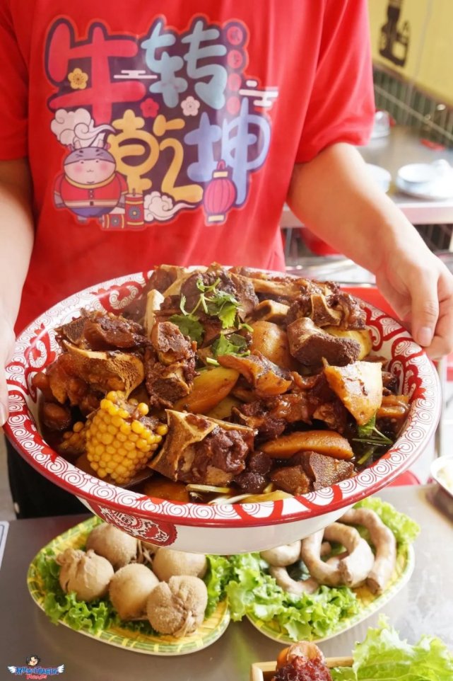 满满登登一大盆牛骨,哦哟,比盆都高出不少。甭管你胃口多大,看到这心里都得支棱起来:吃撑,是对这盆牛骨头最起码的尊重,整就对了。