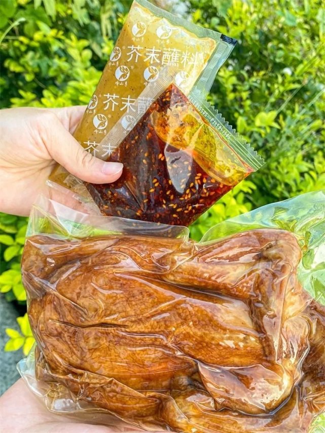 每只鸡都附带两包料包,一包芥末酱一包辣椒油。尝过五香原味后,可以继续安排两种料包。