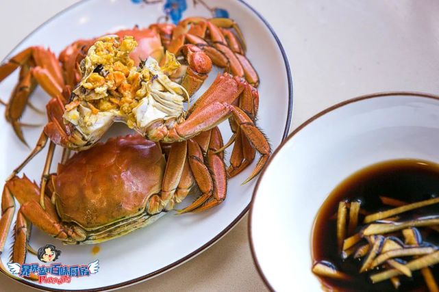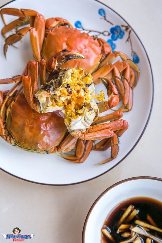 想要吃的更丰富一些的可以调个姜醋汁蘸着吃(姜末+陈醋+海鲜酱油),拽着河蟹的腿将它连着身体掰开,蘸一点姜醋汁送进嘴里,去腥去寒,好吃+保护胃双重收获,养生小达人就是我!