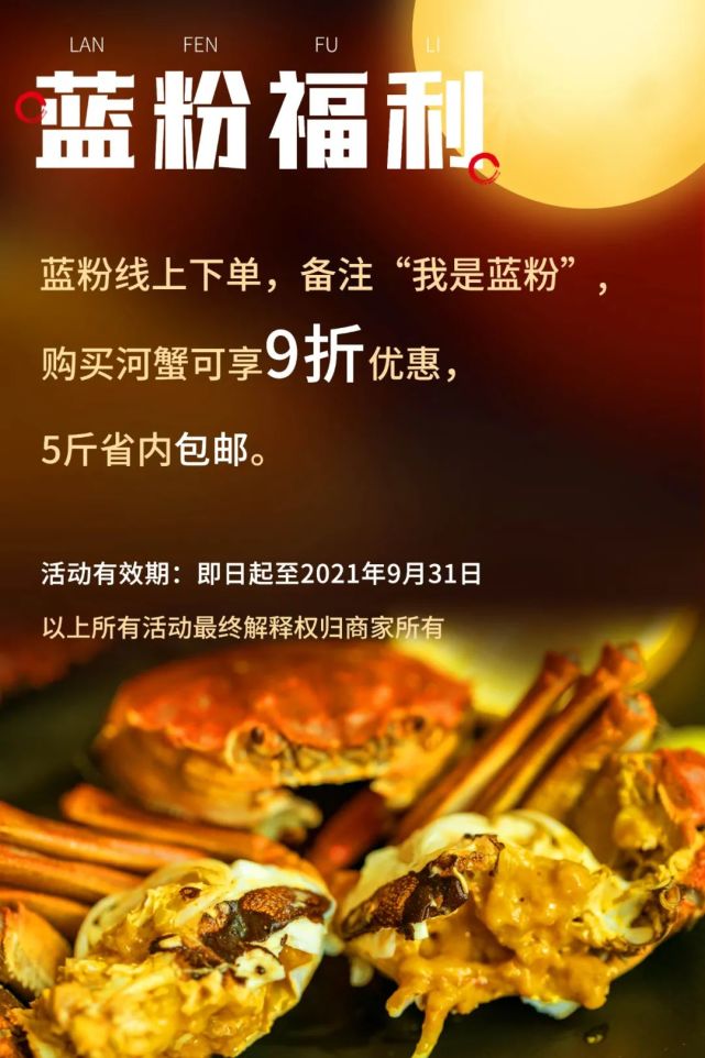 今年的河蟹品质依然在线,价格依然实惠,而且老规矩,蓝粉买河蟹还是全单九折!五斤省内包邮!