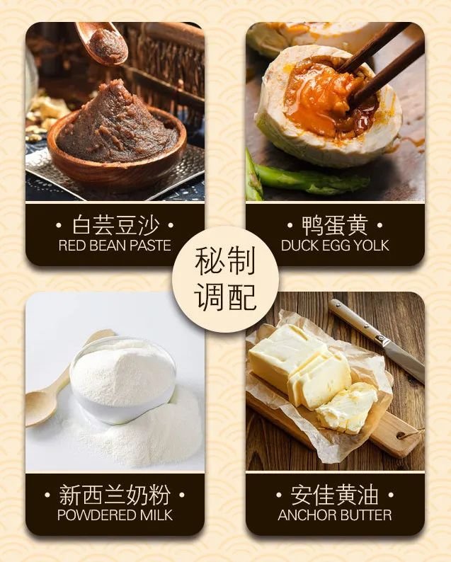 精选上等白芸豆沙配以鸭蛋黄、新西兰奶粉、进口安佳黄油等材料秘制调配而成,香气扑鼻,油润不腻。