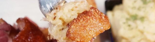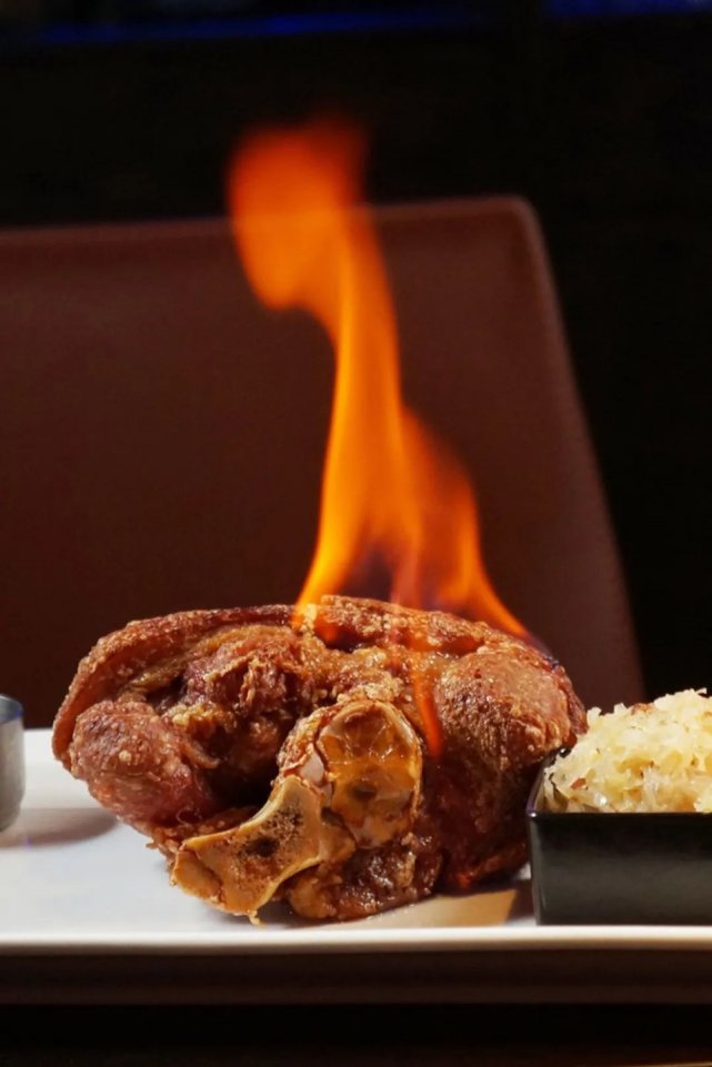 精选猪小肘,抽掉皮下脂肪,文火烤至油脂全部逼出,经过煎烤后表皮香脆可口,内里细嫩多汁,搭配酸椰菜与土豆泥爽口解腻,特别适合配上一杯冰啤酒。
