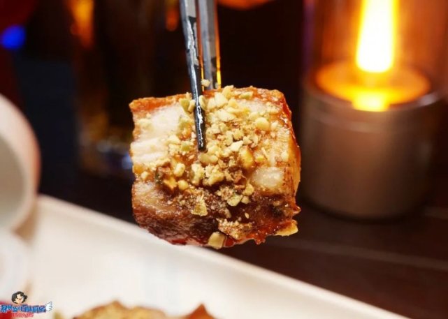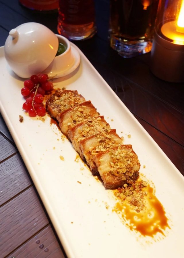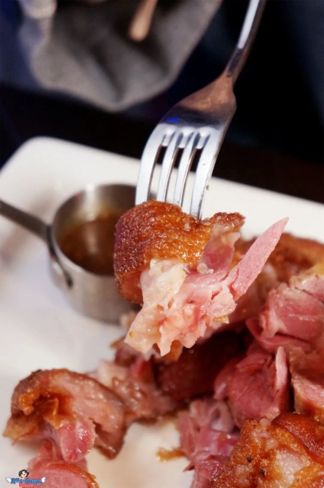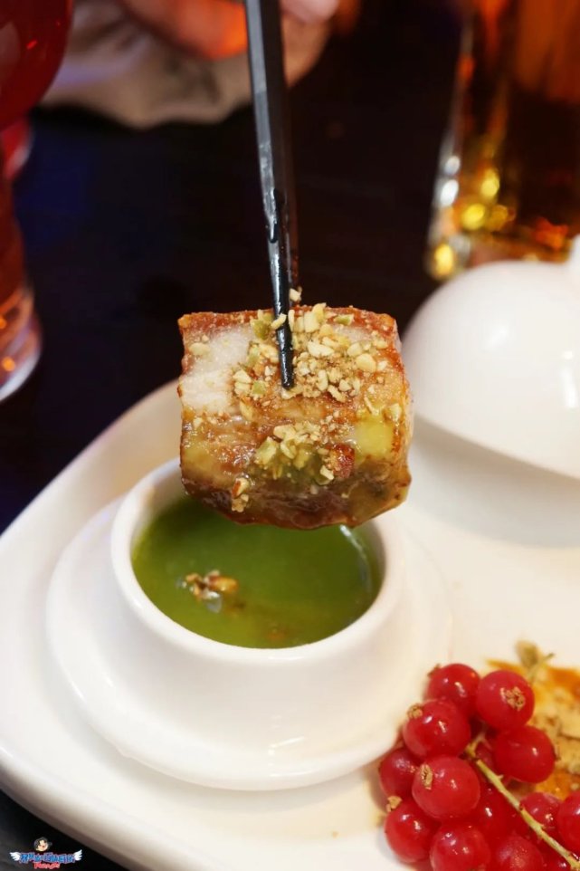 听声音就很好吃的脆皮五花肉,搭配清爽的青苹果酱,外酥里嫩,肥而不腻,每一口都嘎嘣脆。