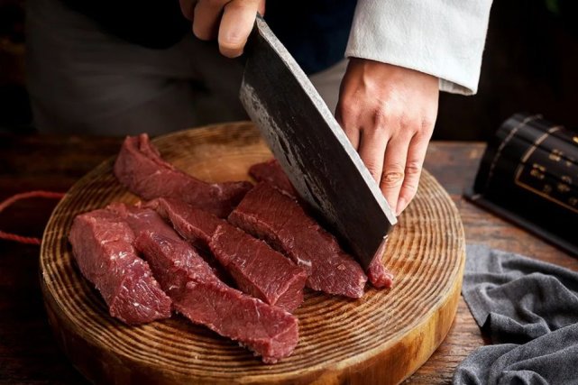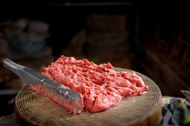 肉浆出胶的粉红色牛肉才算捶打到位了。