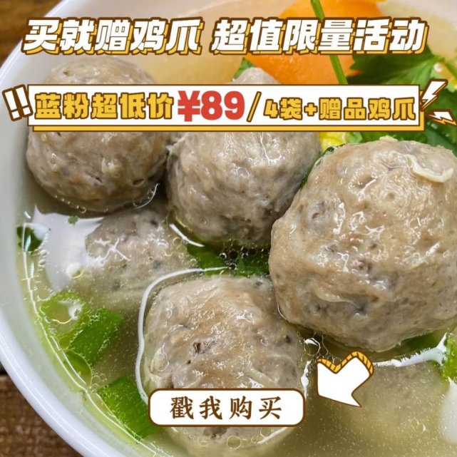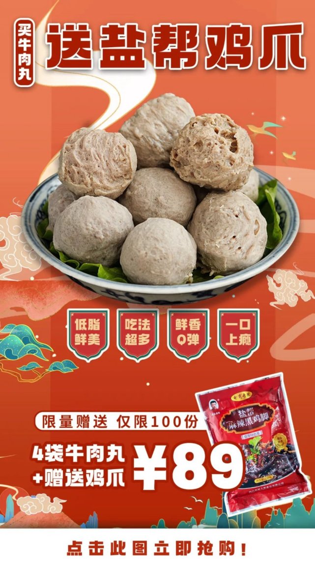 4袋牛肉丸89,还赠送盐帮无骨麻辣黑鸡爪一份!赠品仅限100份,可叠加,多买多送,数量有限,先购先得!