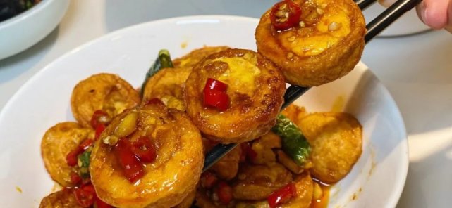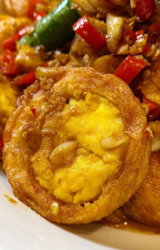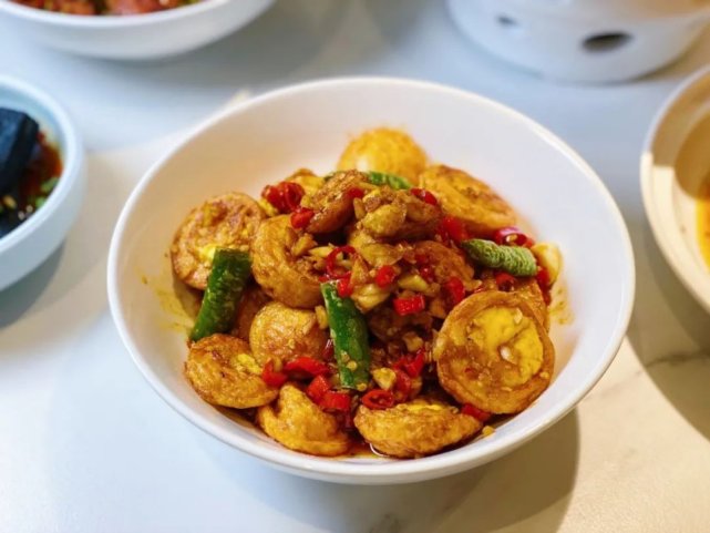 黄灿灿的金钱蛋,经过煎炸和爆炒,表皮焦脆、里层质嫩,再结合辣椒的味道,口味层次更加丰富,让人疯狂分泌口水。