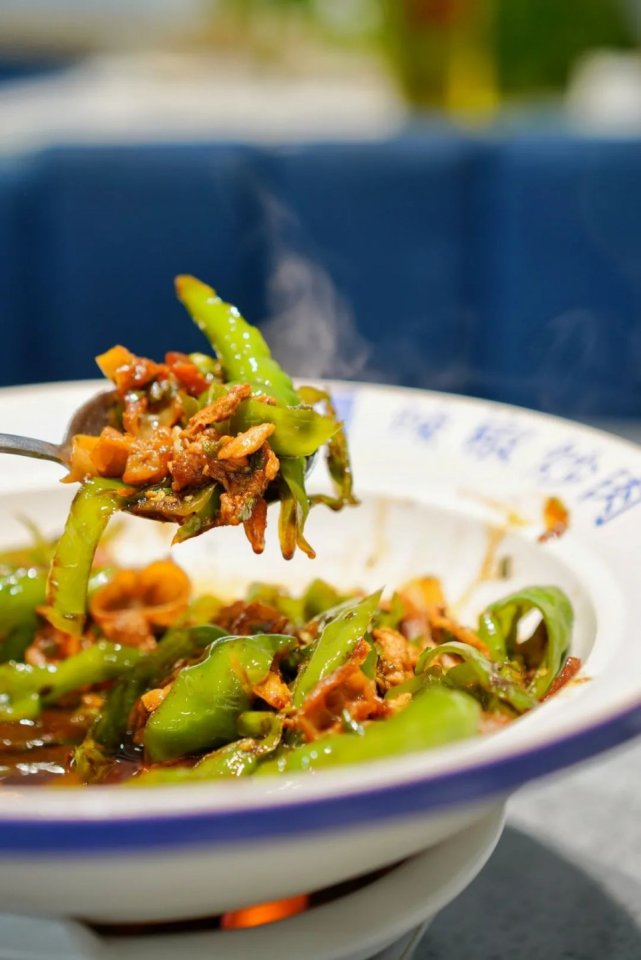 上桌后的金牌辣椒炒肉会盛放在加热容器上,盘子底下有一个小蜡烛不断加热,整道菜越吃越入味,越吃越辣,越吃越停不下来,米饭杀手无疑了!