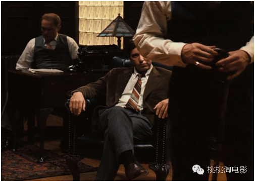 Corleone)的西服套装无疑将角色形象深化得更为立体、鲜活。他干净利索的装扮和那咖啡色,或是浅色的西装,在影片开头都折射出了迈克与父亲那黑手党生活的明显界线。但是随着影片剧情的发展,我们发现迈克的西装颜色变得更深,同时也更为华丽(那些精美的三件套),这无疑预示着他向罪案与腐化生活的过渡。