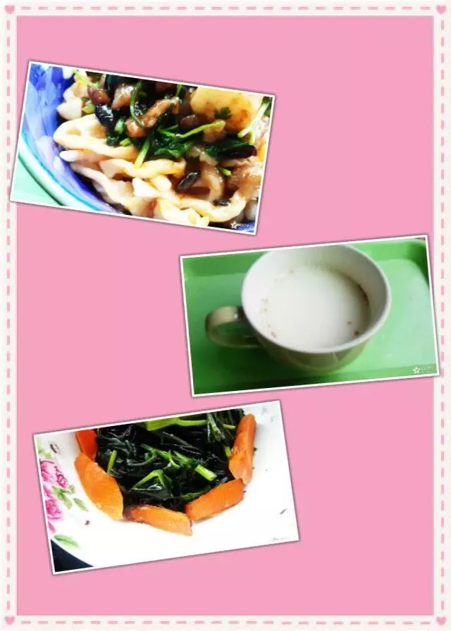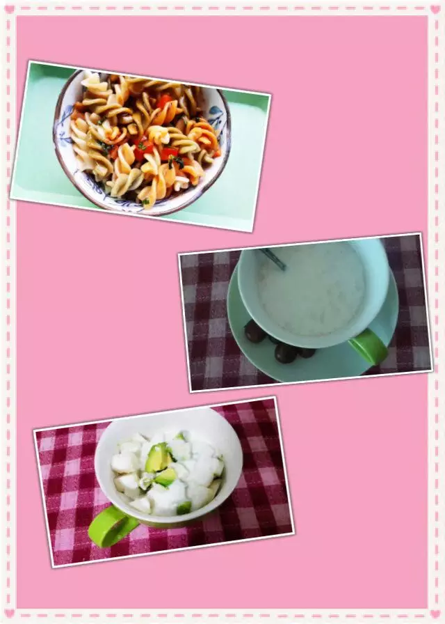 五色早餐之一,罗勒叶五色蔬菜面,搭燕麦牛奶、水果鸡蛋沙拉和煎蛋。