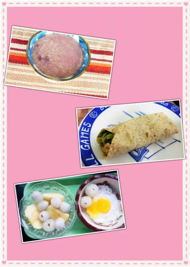 五色早餐之二:紫薯粥,搭蔬菜豆干卷饼、煎蛋和水果。