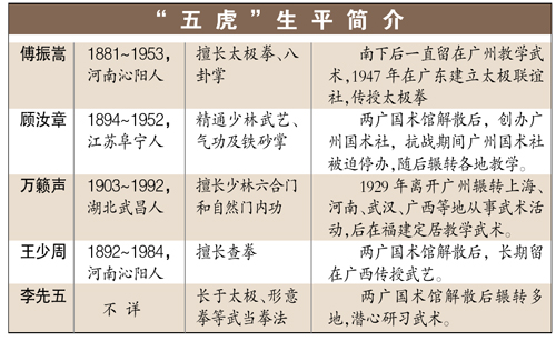 一度轰轰烈烈的“五虎”,至此各奔东西。一直留在广州的,只有一位傅振嵩。据傅振嵩的孙子傅文龙介绍:“1928年,爷爷在南京‘中央国术馆’担任八卦掌总教师,两广国术馆成立后,应邀南下广州,从此扎根。”在广州,傅振嵩结合南拳的一些特点,陆续创立傅式太极拳、太极闪电拳和八卦推手,形成了傅家拳刚柔相济、舒展灵活的独特风格。