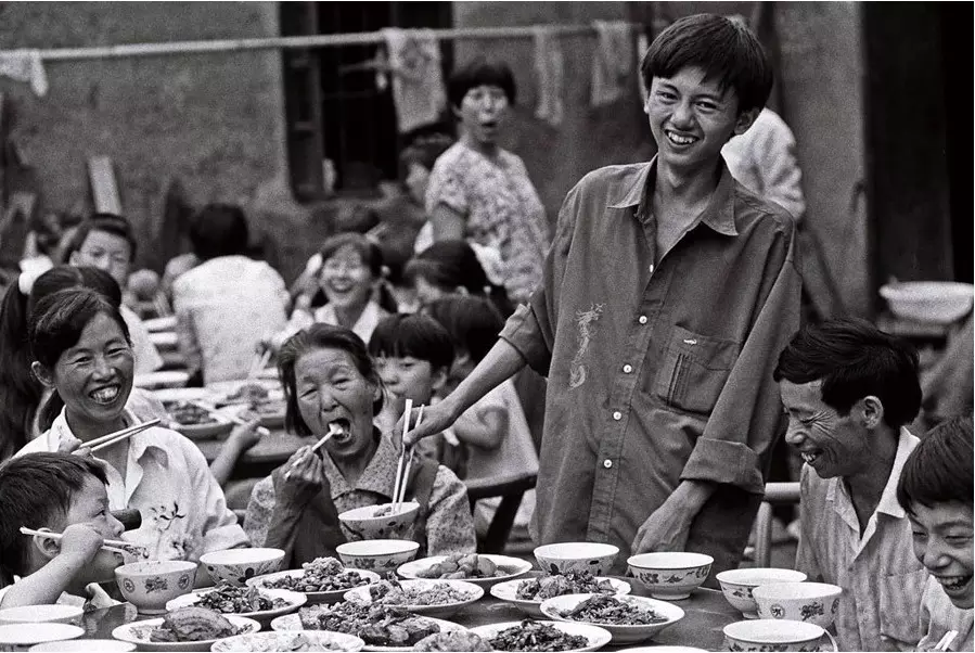 湖北三峡坝区三斗坪镇东岳庙村黎开英的儿子望军在1994年全国高考中,以651分的好成绩考入清华大学汽车工程系,乡亲们纷纷来到他家祝贺,望军不停的给大家夹菜以示感谢。