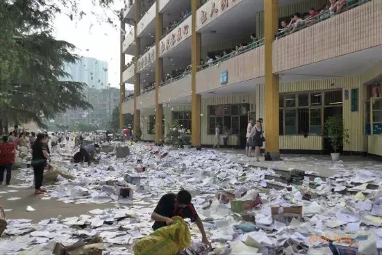 2014年临考前几天,四川巴城部分学校考生用撕书、扔书的方式释放压力,迎接高考。