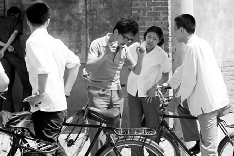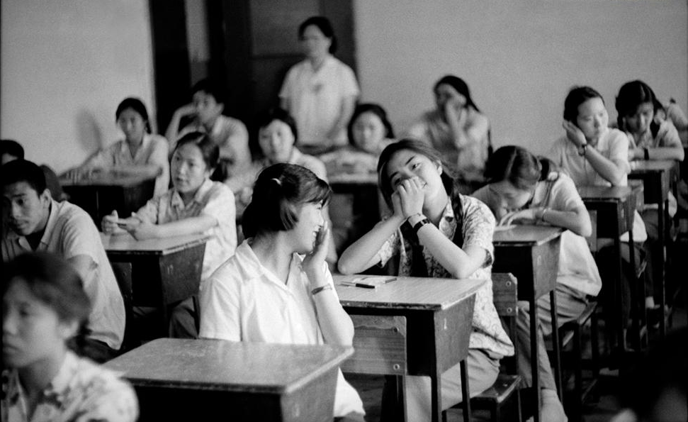 1980年高考开始前,北京75中学考场,两位女生在交谈。