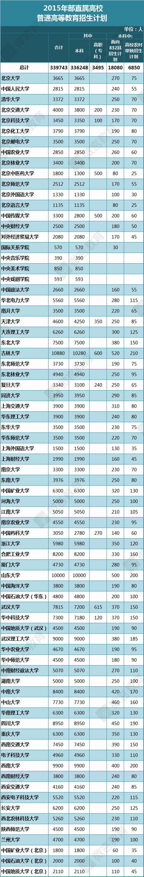 近日,教育部办公厅印发《关于下达2015年部直属高校普通高等教育招生计划的通知》(以下简称《通知》,点击左下角“阅读原文”查看全文),要求部属各高等学校不断完善招生计划管理,统筹好招生计划增量安排和存量调整,着力深化综合改革,优化教育结构,促进教育公平,把重点放在提高质量和内涵式发展上。
