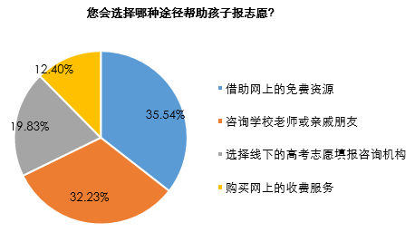 2016年搜狐教育年度消费者调查显示,接近七成的受访者选择"免费"的方式帮助孩子报志愿,35.54%的人会借助网上的免费资源,32.23%选择咨询学校老师或亲戚朋友。