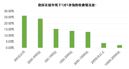 搜狐教育对不同城市线下1对1咨询费做了调查,数据显示收费从几百元到几万不等,逾九成机构收费在千元以内,主要集中在500元以内(占比26.45%)和2000-5000元(占比23.97%)两档。