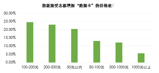 受地域限制和收费昂贵等因素,线上志愿填报系统应运而生。搜狐教育调查显示,从接受程度来看,100-200元的数据卡最受欢迎(占比24.79%),其次是200-500元(23.14%),超八成受访者可以接受500元以内的数据卡。