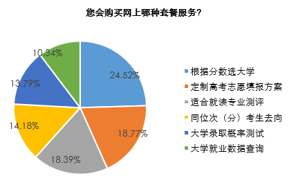 对于网上各种套餐服务的选择,搜狐教育调查显示,受访者最多购买的是"根据分数选大学"服务,占比24.52%,其次是定制高考志愿填报方案(占比18.77%)、适合就读专业测评(18,39%)。