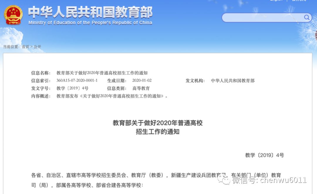 2020年1月9日教育部网站发布《关于做好2020年普通高校招生工作的通知》(教育部阳光高考平台也同日发布),对2020年普通高校招生工作进行全面部署。我们将《通知》中所附《2020年普通高等学校招生工作规定》(简称《2020年规定》)与《2019年普通高等学校招生工作规定》(简称《2019年规定》)逐条对比,大部分内容没有实质性变化。其中变化最大的是对高考加分的控制更加严格。整体看,文件除了个别文字修饰的变化以外,我们可以发现主要有如下18项变化。
