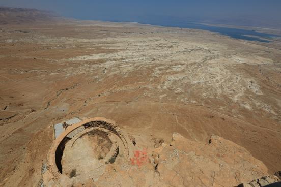 “登孤垒荒凉,危亭旷望,静临烟渚。”是登上马萨达的第一印象。站在马萨达希律王宫殿的高处向下俯瞰,马萨达似乎独立于这茫茫戈壁,在单调的黄土和蓝天的映衬下显得气势磅礴。