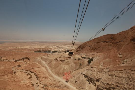 死海在远处与马萨达遥遥相望,海的寂静突出了戈壁的荒凉,这座宫殿几千年的成就与落寞皆由这片海来见证。上山最轻松快捷的方法就是乘坐缆车了,在缆车上马萨达的风景可以一览无余。