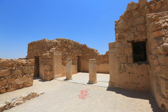 值得一提的是在山上随处可见的引水以及储水装置。马萨达位于茫茫戈壁,要在本就缺水的山上生活下去,一套完整的引水、储水、供水系统必不可少,古人显然也意识到了这一问题。图中这一巨大的储水池在山中还有很多。雨季到来时,通过引水渠收集大量雨水,收集到的雨水传说能供人们使用一年。这些细节无不让人敬佩千年前犹太人的智慧。