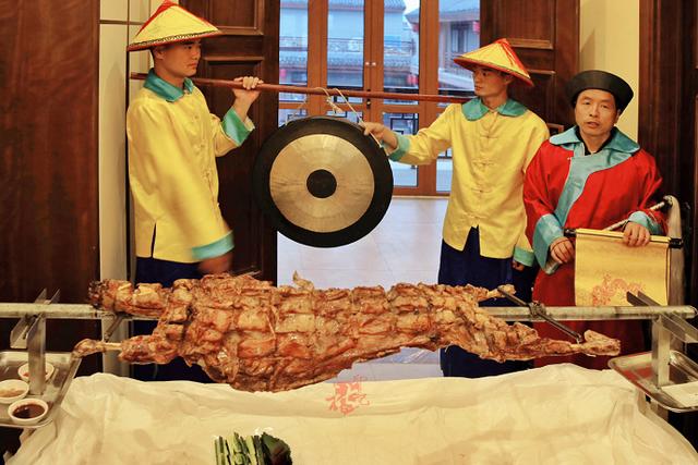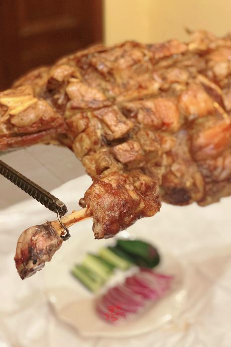 据说此羊选自于锡林郭勒东乌旗一种叫蒙鹿的黑头羔羊。吃天然青草,喝天然溪水,羊儿长期放养,肉质紧实十分适合用来烧烤。将腌好的整只羊,放在炭火之上,慢慢的烤。不停地翻转让羊肉充分受热,并且要在羊肉上用刀横竖划上间隔相等的口子,不停的刷上烤羊师傅用二十种调料、十一种中草药、九种调味品秘制的酱料,让羊肉从里到外充分入味。
