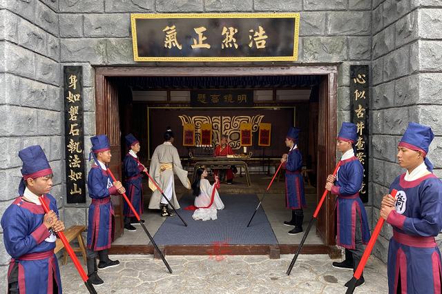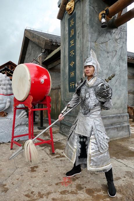 街区以三国为背景搭建,古色古香,足以乱真的戏院、县衙、监狱、学堂穿插其中,身边会突然出现身穿铠甲的武士,谈笑风生的秀才,衣衫褴褛的乞丐,装模作样的算命先生,就像在一条历史长河中逆行。刘关张桃园三结义,活色生香的青楼选秀,还有搞笑夸张的县衙断案,每一个互动表演都有入戏的感觉,瞬间穿越回遥远的古代。