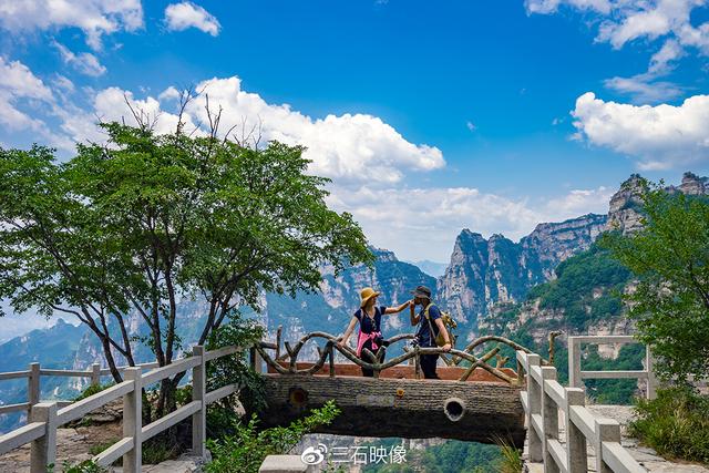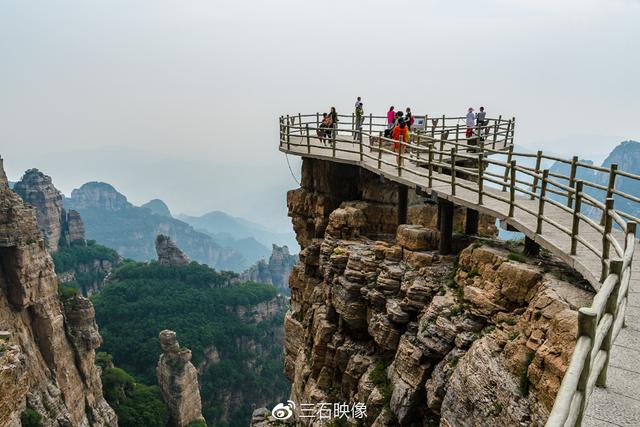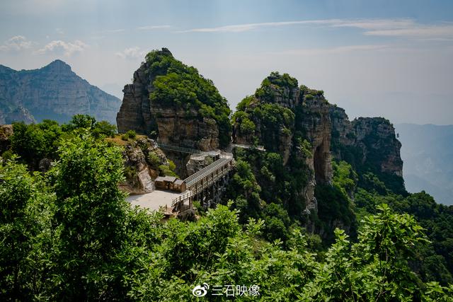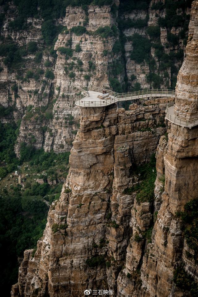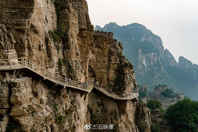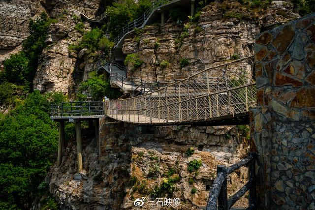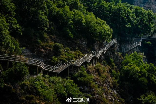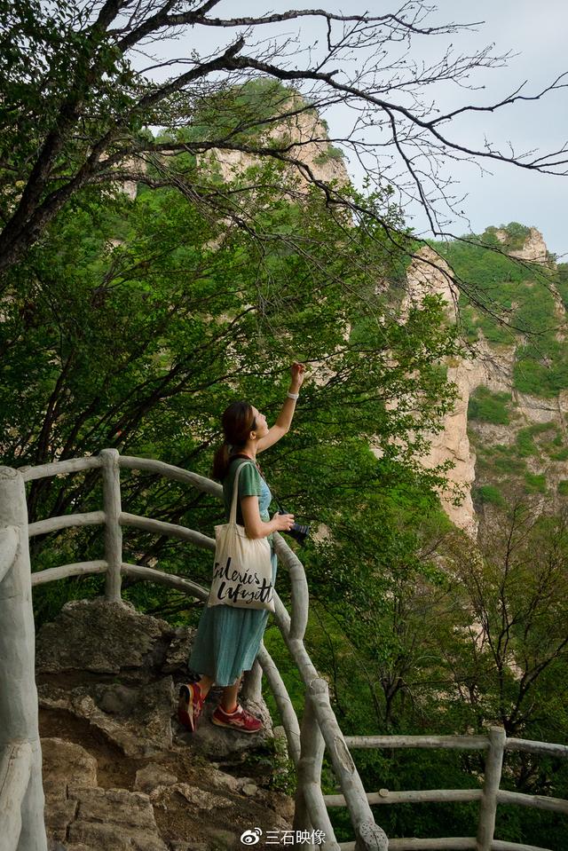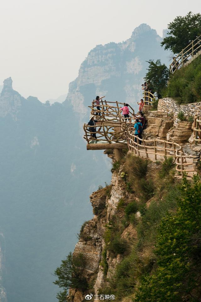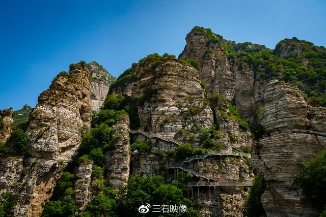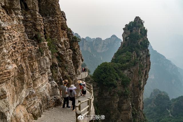 栈道是白石山游览的主要途径,山峰的险峻注定了这里曾经是人迹罕至,但栈道的修建让人们可以在领略奇丽风景的同时,也能享受一份轻松的坦途。依峭壁而建的栈道顺着山体蜿蜒前行,远远看去惊险卓绝,但若身在其上,就能体会到坚实牢固所带来的稳稳的安心。游人们往来穿梭,却是表现各异,有人悠然自得,坦然信步,又有人战战兢兢,如履薄冰。