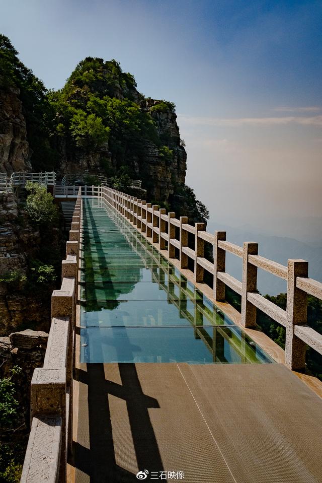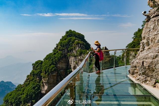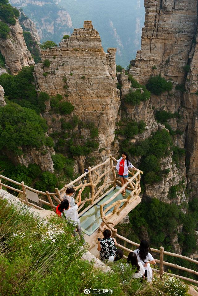 除了绝美的奇景,白石山还有特色的惊险体验,就是栈道中端的玻璃栈道, 这里的玻璃栈道以险、高著称,在各地的玻璃栈道中都算得上翘楚,而且还有白石山独有的双层玻璃栈道,上下辉映,体验更加独特。全透明玻璃打造的栈道体验奇妙,置身其上,宛如悬于空中,但也要看你是否能接受的了这种“心动”感受,不少人也都是扶墙颤颤而行,目不敢旁视。其实完全不需要担心,钢化玻璃材料非常结实牢固,亲身试验,即便是轻轻跳跃,也完全不是问题,不过不推荐大家轻易尝试。